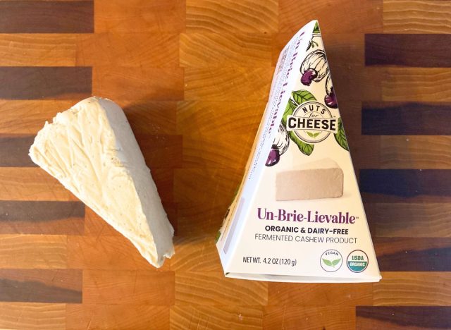 I hate to say that there was nothing about this non-dairy “brie” that I enjoyed. This fermented cashew product from Nuts for Cheese has a strong, sour, almost musty flavor to it that both Linzi and I couldn’t swallow, and unfortunately, it resembles nothing remotely close to a slice of brie cheese.