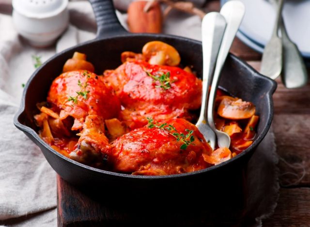 While this dish sounds fancy, the word fricassee is French for “to cut up and fry.” These days, says Natasha’s Kitchen, it refers to chicken cut up, seared, and braised in a white wine cream sauce with assorted vegetables. This is more of a technique than a dish, so feel free to ad-lib with your favorite veggies.