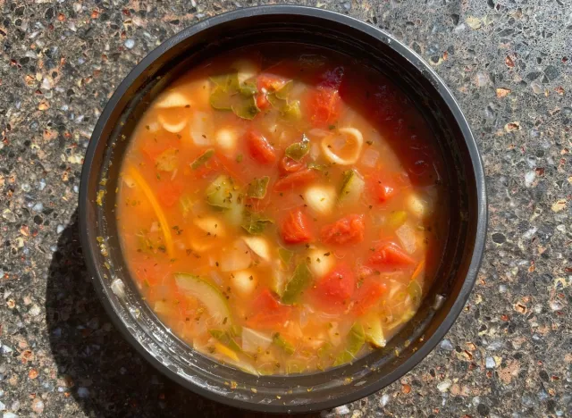 The look: Between the nearly translucent broth and all of the chopped veggies, this was the lightest Olive Garden soup option of the bunch. It was loaded with tomatoes, zucchini, and pasta, and appeared to be spotted with bits of herbs.