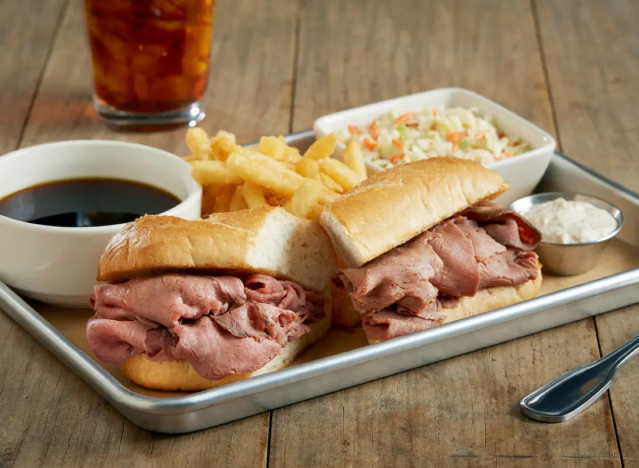The Classic Prime Rib Dip at BJ’s Restaurant & Brewhouse is $18.99 for a hearty, delicious meal. “We thinly carve up slices of slow-roasted prime rib, piled high on a toasted hoagie roll,” the chain says. “On the side, we provide a rich, flavorful au jus for dipping, creamy horseradish for extra zing, coleslaw and a side of fries.”