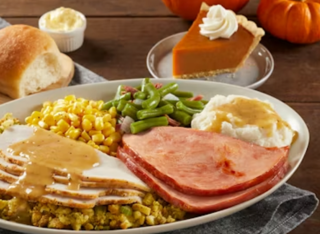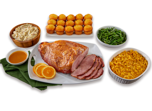 Golden Corral serves up delicious ham and traditional sides year-round, but offers extra special options for the holidays. “Enjoy Roasted Turkey, Glazed Ham or Bone-In Pork Roast. Each meal includes a variety of traditional sides, a dozen yeast rolls and a whole pie. Pick up is available starting November 3,” the chain says.