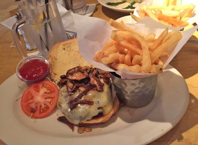 The Cheesecake Factory’s tasty mushroom burger is a must-have if you’re a fan of burgers and want to try one with some edge. Offered under the chain’s Glamburgers options, this one is made with a charbroiled premium Angus beef patty piled high with sauteed mushrooms, onions, melted Swiss cheese, Fontina cheese, lettuce, tomato, and a swipe of mayo. Each order comes with a side of crispy french fries or salad.