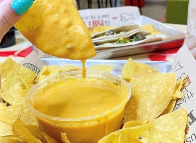 Fast-casual Tex-Mex restaurant chain Baja Fresh also serves an A-plus queso you’ll want to pour on absolutely everything. This spot’s variation is made from three kinds of spicy peppers and melted cheese, and it’s plated with crunchy tortilla chips. Order this with one of the restaurant’s featured menu items like its Nashville Hot Chicken Taco, or a classic like a Chicken Baja Burrito, for a truly memorable meal that is both flavorful and won’t break the bank.