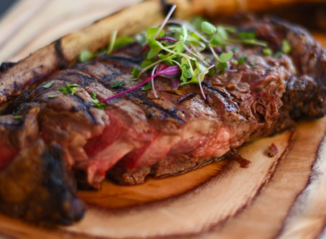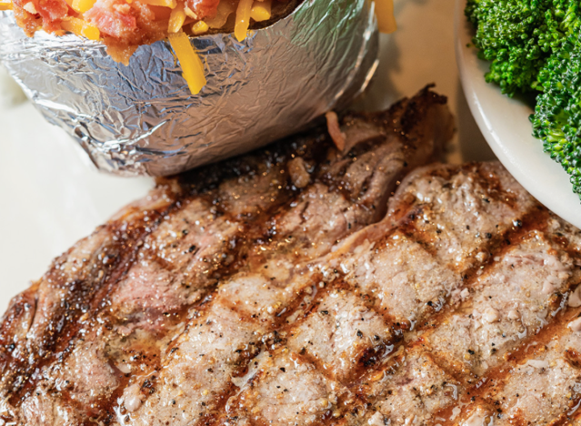 Logan’s Roadhouse is also a budget-friendly chain that offers a 12 ounce or 16 ounce ribeye at cost-effective prices, but doesn’t skimp on quality or taste. “They still hand-season their ribeyes with a straightforward blend of salt and spices rather than relying on pre-made rubs,” says Gunterman. “The steaks are cooked over hickory wood flames instead of just gas or infrared heat, giving them a clean crust and a subtle ring of smoke that’s rare in casual dining. It’s a simple approach — but well-executed and perfectly timed.”