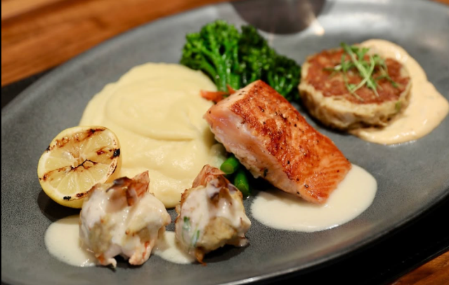 While different to the typical fried offerings for seafood baskets, McCormick & Schmick’s Broiled Seafood Platter is a delight: The Crab Cake, Salmon, Stuffed Shrimp, Mashed Potatoes, and Seasonal Vegetables will satisfy anyone who is craving a little variety. There are also plenty of shareable options like Crispy Fried Calamari.