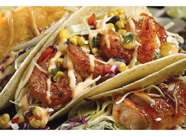 Tex-Mex restaurant chain On the Border offers a unique spin on the traditional shrimp taco. Its honey chipotle shrimp tacos give an extra boost of flavor as they’re made with grilled shrimp tossed in a honey chipotle sauce for that perfect balance of sweet and spicy. The dish also doubles down on the heat with a spicy avocado ranch, cilantro, and shredded cabbage. It comes served with a side of rice and beans.