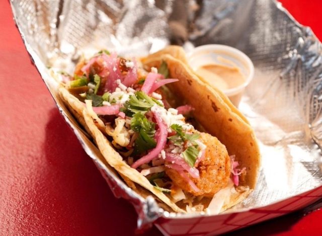 Leave it to Del Taco to serve fan-favorite tacos available at the speed of a drive-through. This highly rated fast-food restaurant chain stands out for many reasons, including the crispy jumbo shrimp tacos. These shrimp tacos come with Del Taco’s savory secret sauce, crunchy shredded cabbage, and pico de gallo, all wrapped in flour tortillas. According to Del Taco’s website, the shrimp tacos may not be around forever, so be sure to order them while the ordering’s good.