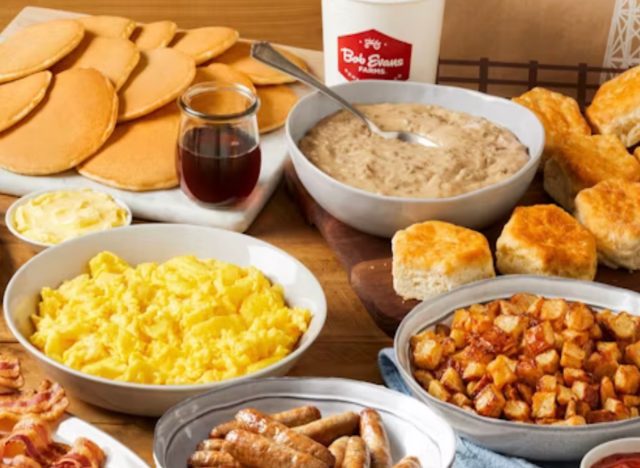 Bob Evans prides itself on huge portions. The chain even has a menu section devoted to “Family Breakfast.” For example, you can order Brunch for a Bunch bundle serving up to eight people. It comes with a “large portion of farm-fresh scrambled eggs, 12 hotcakes with butter and syrup, 12 strips of center-cut hardwood-smoked bacon, 12 sausage links, a dozen freshly baked buttermilk biscuits, homemade sausage gravy, and a family-size portion of home fries.”