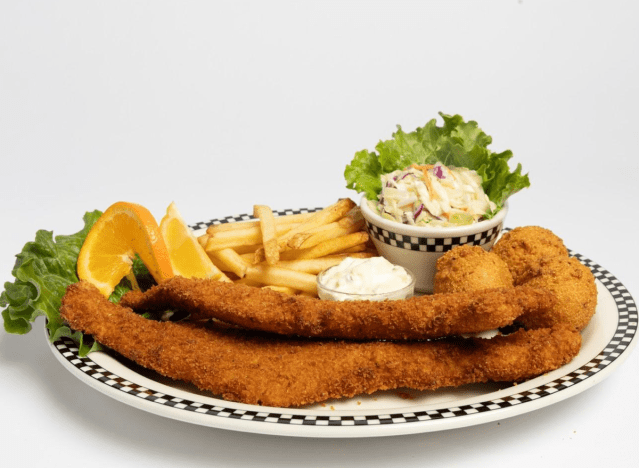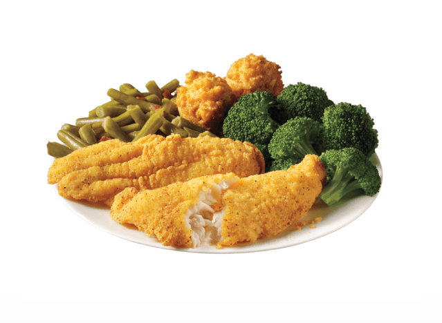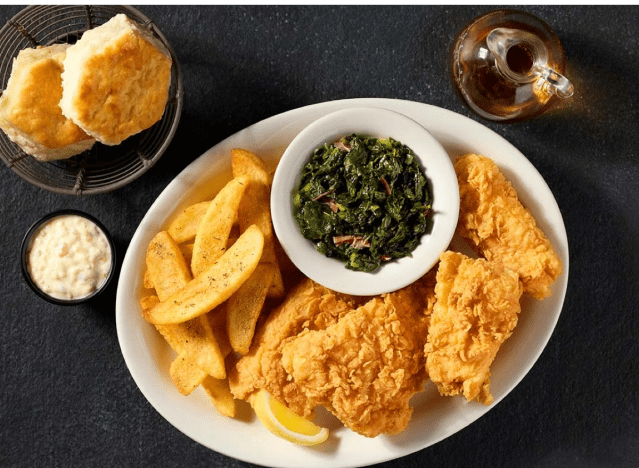 Cracker Barrel is constantly called out for having delicious southern food and their Cornmeal Crusted Fried Catfish is no exception. Served with traditional southern sides like fried okra (can vary based on location), it’s an incredibly flavorful meal. “I ordered the Friday fish fry which was in-house breaded cod strips. They were amazing! Lightly battered and very tasty. It came with fries, Cole slaw (awesome homemade slaw by the way) and fresh biscuits,” a reviewer said on Yelp.