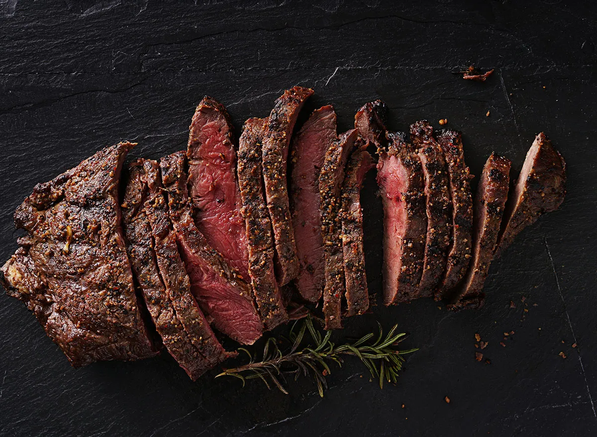 A Flat Iron steak is also known as a Boneless Top Chuck steak, as it’s taken from the top blade. While not a super tough cut of meat, it is lower in fat and does have a section of tough gristle that needs to be removed. “These cuts tend to be less expensive and cooking them low and slow brings out their rich collagen, adding flavor without needing lots of extra fats,” says Celine Thompson, MS, RDN.