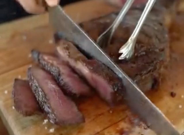A giant tomahawk steak, perfectly cooked and ready to eat, is one of the most delicious steaks you can get—but it’s not for the faint of heart. These gigantic long-bone options often start at around 34 oz, and are made to share at the table. So what makes a tomahawk so special? “While it’s rapidly gaining notoriety in the culinary world, it’s still not commonly found on most menus. Our Prime Tomahawk steak is a superior, highly marbled cut of beef that delivers on all fronts: flavor, presentation, tenderness, size, and value,” say the experts at Fleming’s. Intrigued? You should be. Here are seven steakhouse chains known for their cowboy-size, giant tomahawk steaks.