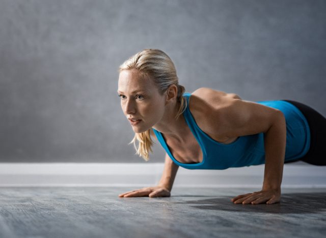 Pushups build upper-body strength and engage your core muscles for stability. This classic compound movement can help strengthen your entire midsection and support fat loss. Plus, it offers several variations for you to use as your fitness progresses. McNulty advises, “Use a wall or perform these from your knees if full pushups are too difficult.”
