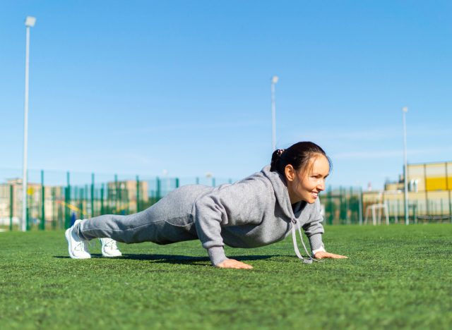 “In the case of underarm fat, strong muscles surrounding the armpit will improve your posture and add a beautiful shape all around the area,” Najjar explains. “Strong muscles will support any fat that remains preventing rolls and flabby wings in the area.” Below are seven top-recommended exercises from Najjar that will help melt your armpit pooch and get your body into shape. Keep reading to learn all about them, and when you’re finished, be sure to check out the 10 Strength Exercises To Eradicate Underarm Fat in Your 40s.