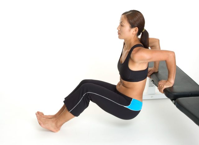 To set up for tricep dips, sit on the edge of a workout bench with your hands planted flat on the surface; your fingers should point forward toward your toes. Hold onto the edge of the bench as you lower or “dip” your body down, bending at the knees, before lifting yourself back up. Make sure your back stays close to the bench. Complete three sets of eight to 12 reps.