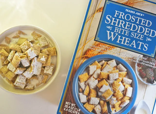 Similar to Kellogg’s Frosted Mini-Wheats—but with a much longer name—TJ’s Frosted Shredded Bite Sized Wheats come in a 20-ounce box for $3.49.