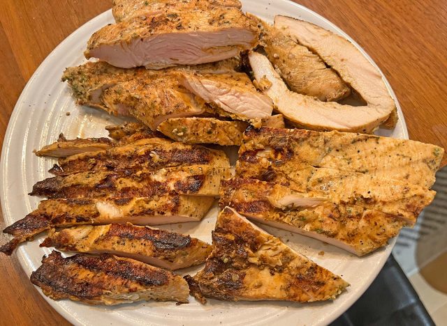 The look: Lean and green. The pack contained seven separate pieces of breast meat in various sizes. Initially, the chicken comes heavily coated in its grassy-colored dressing—the item contains up to 21% pesto sauce, according to the package—but much of that stuff slides off the meat during cooking, leaving behind only faint traces of basil and parsley on the finished product.