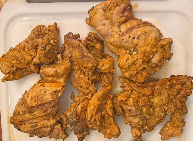 The look: Awash in reddish orange. The pack contained seven chicken thighs of various sizes, which took on alluring brown streaks from their brief time on the grill (just 7 to 10 minutes, per instructions).