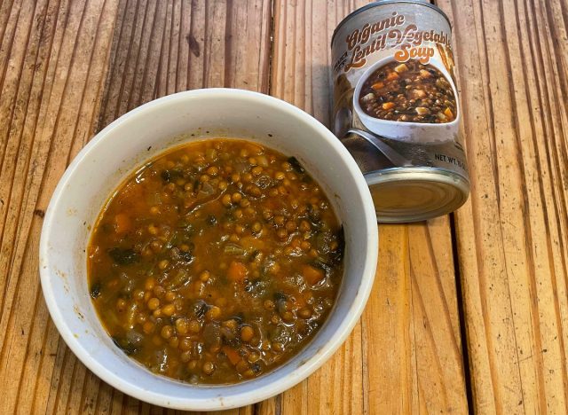 I almost didn’t pick up this can of soup because frankly, it looked a little sad next to all of the other options, but I’m so glad I did! This lentil soup had a beautiful fall harvest color right out of the can that made me want to dig in. And although it needed lots of salt and pepper, this soup was mostly nutritious and delicious. While I’m a little worried about the high sodium here, this is one I’d toss in my shopping cart again. Added bonus: at $2.49, it’s also the most affordable option of the whole haul!