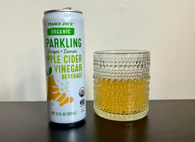 Trader Joe’s offers several apple cider vinegar drinks, each of which contains one tablespoon of the fermented liquid. The Organic Sparkling Ginger + Lemon Apple Cider Vinegar Beverage is made with carbonated water, organic apple juice concentrate, organic apple cider vinegar, organic ginger juice, organic lemon juice concentrate, and natural flavors. I purchased one can for $1.99.