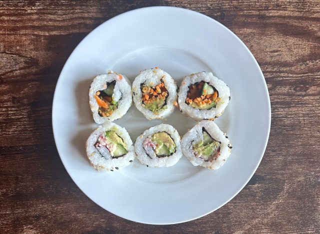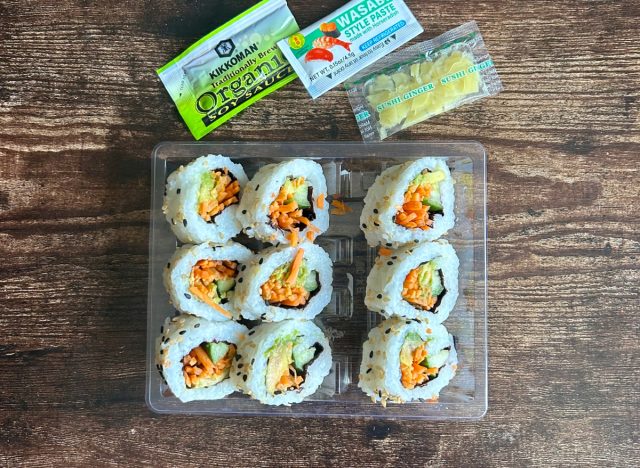 The look: Unsurprisingly, the carrots, cucumbers, and avocado were a little more sloppily stuffed into the rolls than what you’d see at a typical sushi restaurant. Some rolls had slightly more avocado and carrots than others, while the single small cucumber chunk was about the same size across each roll. Meanwhile, the sesame seed-speckled sushi rice was shiny and looked rather gelatinous. Could the Redditors be right?