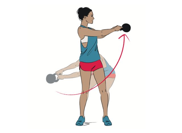 Stand with your feet shoulder-width apart and hold a kettlebell with both hands. Start by swinging the kettlebell between your legs. As you swing it forward, rotate your torso to one side, allowing the kettlebell to move across your body. Keep your core engaged and your back straight throughout the movement. Swing the kettlebell back between your legs and repeat the motion, rotating to the other side. Continue alternating sides for the desired number of reps. Focus on controlling the kettlebell and using your core to power the rotation.
