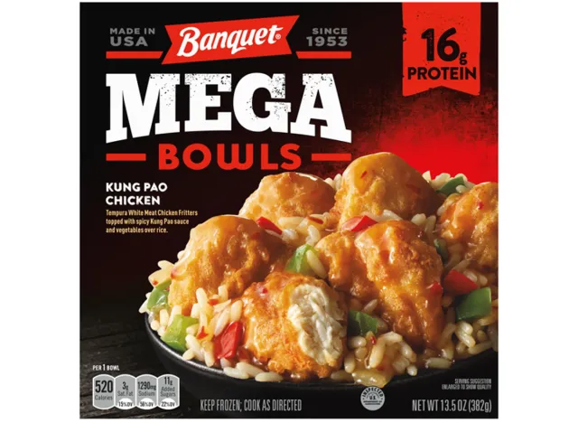 Banquet Mega Meats Kung Pao Chicken is covered in a sauce that brings a little heat and a little sweetness. Together, it makes for a mega-salty meal that has as much sugar as you would get from one Original Glazed Krispy Kreme Donut.