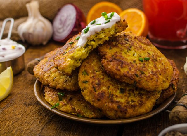Seen on appetizer lists and fairly easy to make at home, cauliflower fritters are made with a combination of cauliflower, eggs, flour, and seasoning before being cooked in oil. This turns a very low-calorie vegetable into one packed with calories and low-quality fat grams. On top of that, once dipped in aioli sauce, another calorie-packed component of this dish, you have a veggie-based appetizer that may contain more calories than an entrée!