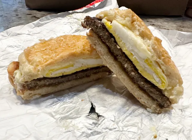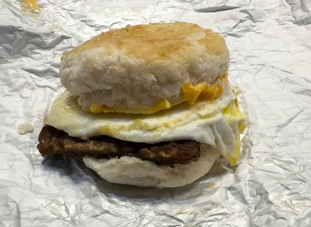 A variation on the biscuit theme, this option swaps sausage for bacon, creating a version of the sammie, which is affectionately known as a BEC (bacon, egg, and cheese). But the bacon isn’t any old slice. It’s applewood-smoked bacon, which should present a mild sweetness. Despite the protein swap, this sandwich still rings up at $3.79, as did its sausage relative.