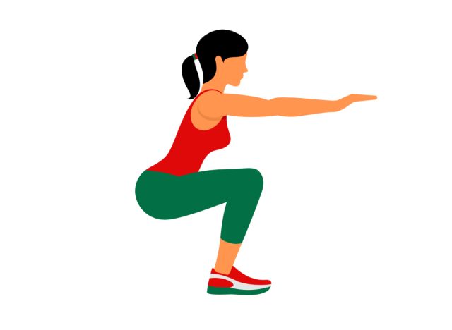 Stand with your feet shoulder-width apart. Slowly lower your body as if you were sitting back in a chair, keeping your chest up and your knees behind your toes. Aim to lower yourself until your thighs are parallel to the ground. Perform two sets of 12 to 15 repetitions.