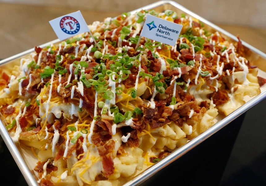 These loaded fries are a combination of fat, grease and, well, more fat. And we're not talking the good kind of fat. Bacon, cheddar cheese, and sour cream top waffle fries at the Captain Morgan Club in Globe Life Park.