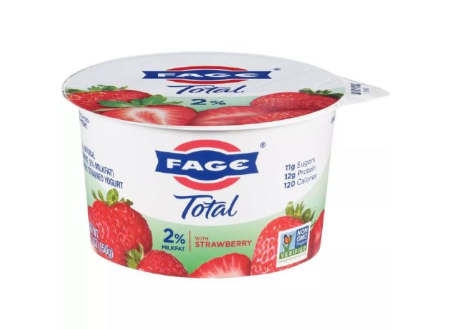 Don’t let the fruit in FAGE Total 2% Mixed Berries fool you, it still comes along with 7 grams of added sugar. While not the highest on this list, added sugar is an empty source of calories that is unlikely to contribute to your feeling of fullness after eating. In fact, the second ingredient listed in the berry mixture is cane sugar, even before the actual fruit! Add your own fresh or frozen fruit when possible to boost nutrients without added sugar.