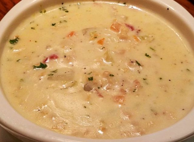 You might think a shellfish soup is the perfect side or starter, but this stick-to-your-ribs bowl is probably best enjoyed as a main. Each order of Clam Chowder has 710 calories, 44 g fat, 2,130 mg sodium, 47 g carbs, and 25 g protein, which is about half of the daily recommended calories for the average woman.