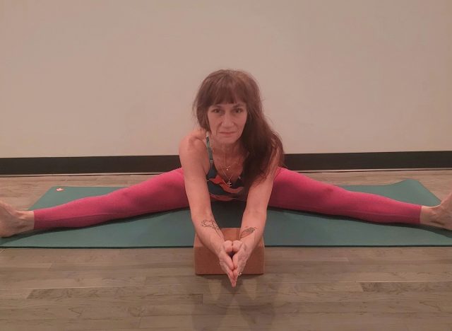 The wide-legged forward fold stimulates your mind and soothes pain from headaches and fatigue by flowing blood to the brain, explains Hughes-Smith. In addition, it stretches out your back, hamstrings, and calves.