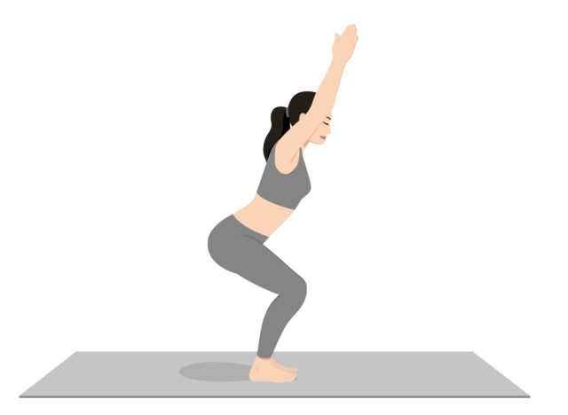 “Chair pose will work your entire body while strengthening your abs,” Zucker notes. “You’re holding the bottom of a squat position and using your ab muscles to lift your torso and spine straight. It’s a major workout for your lower body. Also, supporting your weight will raise your heart rate, leading to a greater calorie burn.”