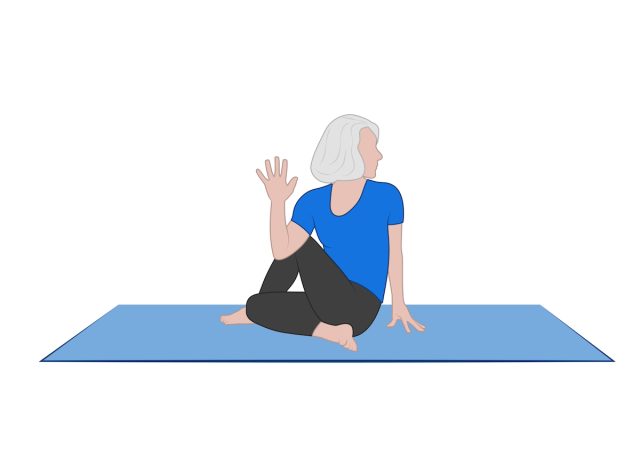 Get started in a seated position with your legs extended. Bend your knees slightly, and tilt your pelvis a bit forward so your lower back is elongated. Bring your right foot over your left leg. Place the sole of your right foot on the ground, planted right outside your left knee. Your right hand should be grounded to the ground behind you. Breathe in as you elongate your spine, and breathe out as you twist to the right, wrapping your left arm around your right shin.